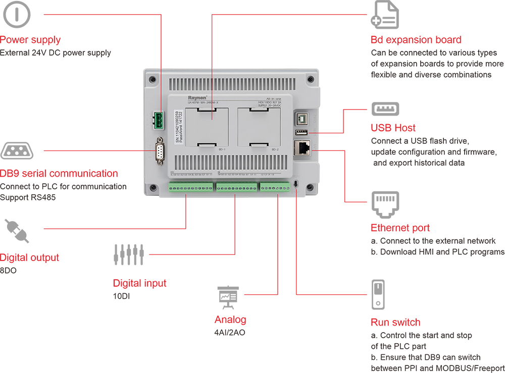 | | • Stöder industriella internetfunktioner och kan fjärrstyras; • Nätverksporten kan ladda ner HMI- och PLC-program direkt för enkel nedladdning; • Huvuddelen stöder digitala och analoga kvantiteter, som kan väljas därefter; • Stöder 2 BD-expansionsversioner för att flexibelt anpassas till olika behov på plats; • PLC-delen använder programmering i japansk stil |