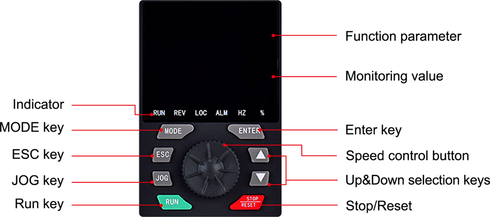 | Jogg kontroll | Motorn kan startas och stoppas omedelbart; jog frekvens inställningsområde: 0,0-20,0Hz; jog stop-läge: retardation/fri/DC-bromsning |