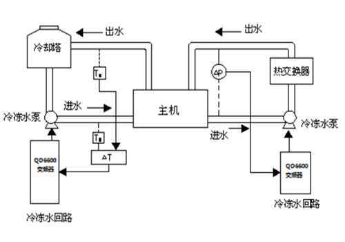 | 04 systemintroduktion: I detta system drivs två 110KW kylvattenpumpar av två D71 110KW växelriktare, och det finns även flera D71 växelriktare som driver fläktar (inklusive inomhusfläktar och kyltornsfläktar). I kylvattencirkulationssystemet skickas signalen 1 (temperatursignal eller trycksignal) från vatteninloppskretsen och signalen 2 (temperatursignal eller trycksignal) från vattenutloppskretsen till den analoga modulen för att erhålla den analoga återkopplingssignalen från växelriktaren. Genom växelriktarens inbyggda PID-funktion realiseras den automatiska styrningen med sluten slinga. | | ||||||||||||||||||
